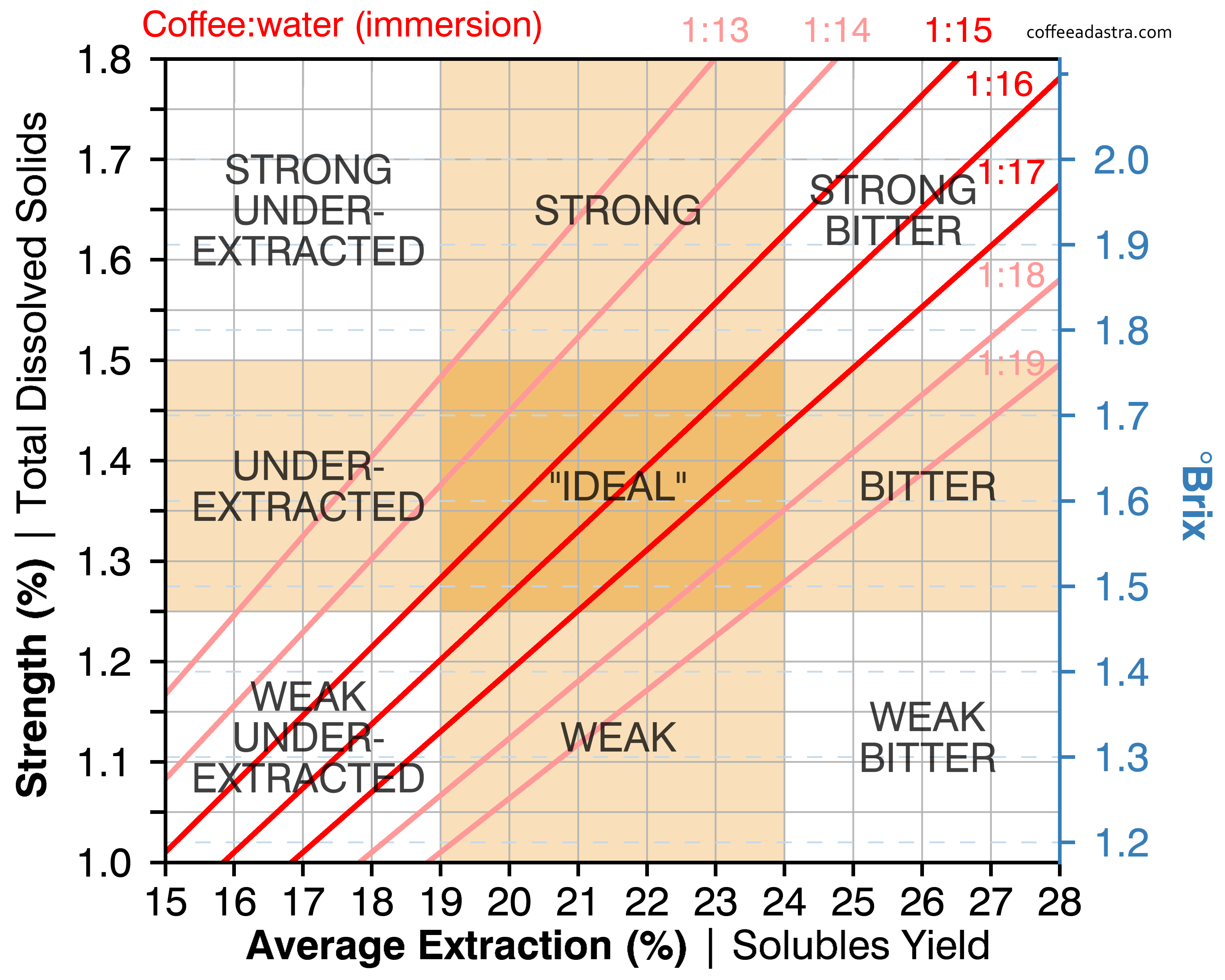 Here’s an updated coffee control chart that assumes a liquid retained ratio of 2, which is much more appropriate for percolation brews than the one I had posted in my first blog post: