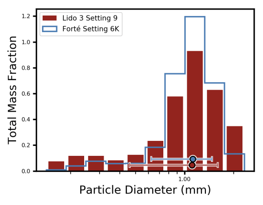 As you can see, we are able to see a difference, albeit a small one: the beans ground one at a time are indeed about 0.08 mm² coarser than those ground with a full hopper. To get a better sense of how coarser they are, I compared the bean-by-bean dose to other full-hopper grind sizes on my Forté, and determined that the closest match was to setting 6Q: