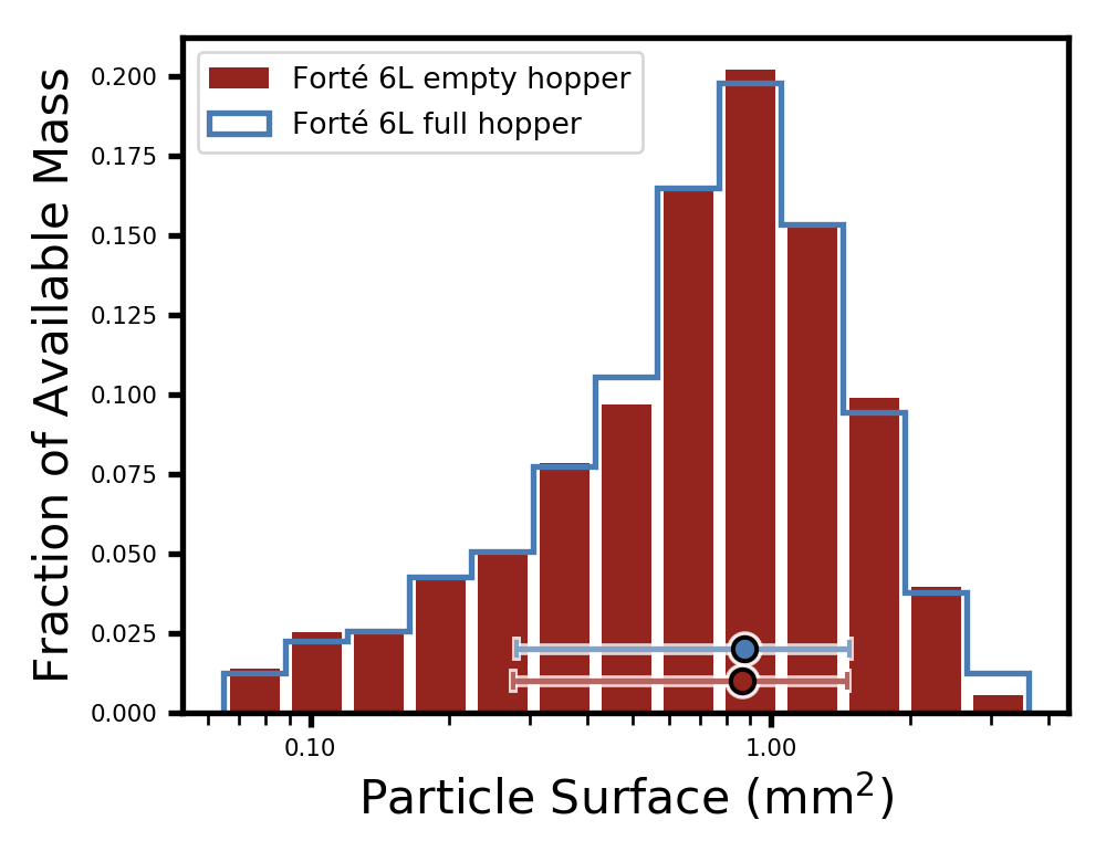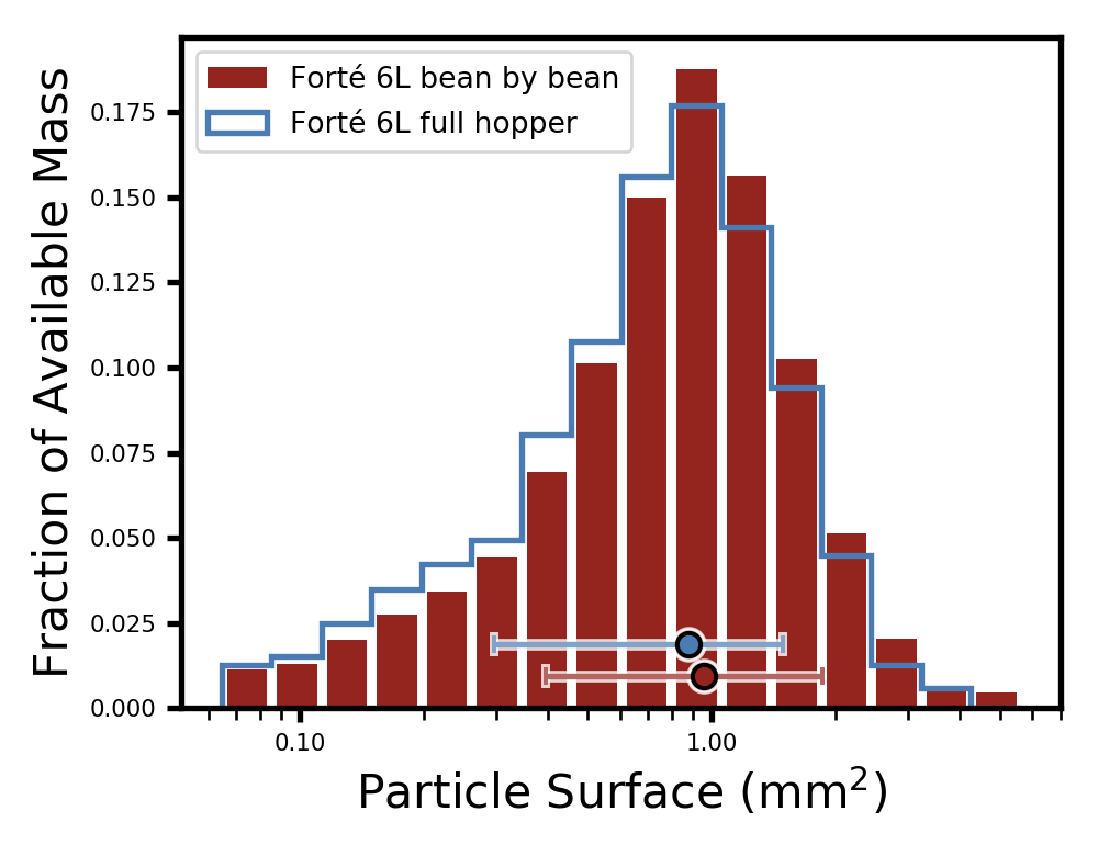 What I call the “fraction of available mass” in this figure is the mass of coffee that is available for extraction if you assume that only outer shells of 100 micron are extracted in each coffee particle. This is just an approximation, but it is already more meaningful than just looking at the total mass of coffee particles. For more information, I suggest reading this previous blog post where I discuss a very interesting experiment carried by Barista Hustle to explain why this approximation makes sense. Basically, we want our particle size distributions to contain some information about how the coffee will extract, so we don’t care about weighing the cores of coffee particles that will never be extracted. I also talked about this more here and here. Another thing to notice in the figure above is that the horizontal axis indicating particle surfaces is in logarithmic scale. This means that every shift of e.g. 60 pixels to the right corresponds to a particle size twice as large. On top of each distribution, there is also a single data point with horizontal error bars, that respectively indicate the average particle surface and the spread of the distribution on each side.