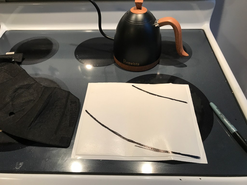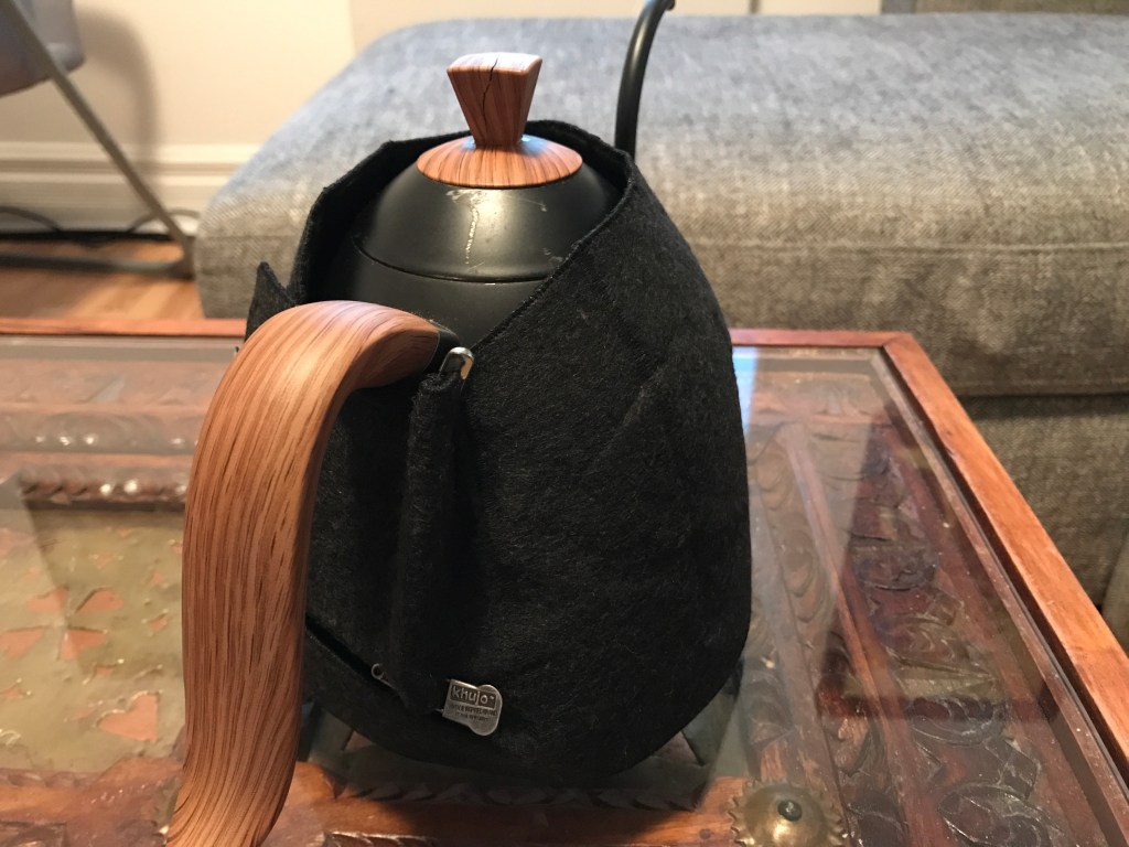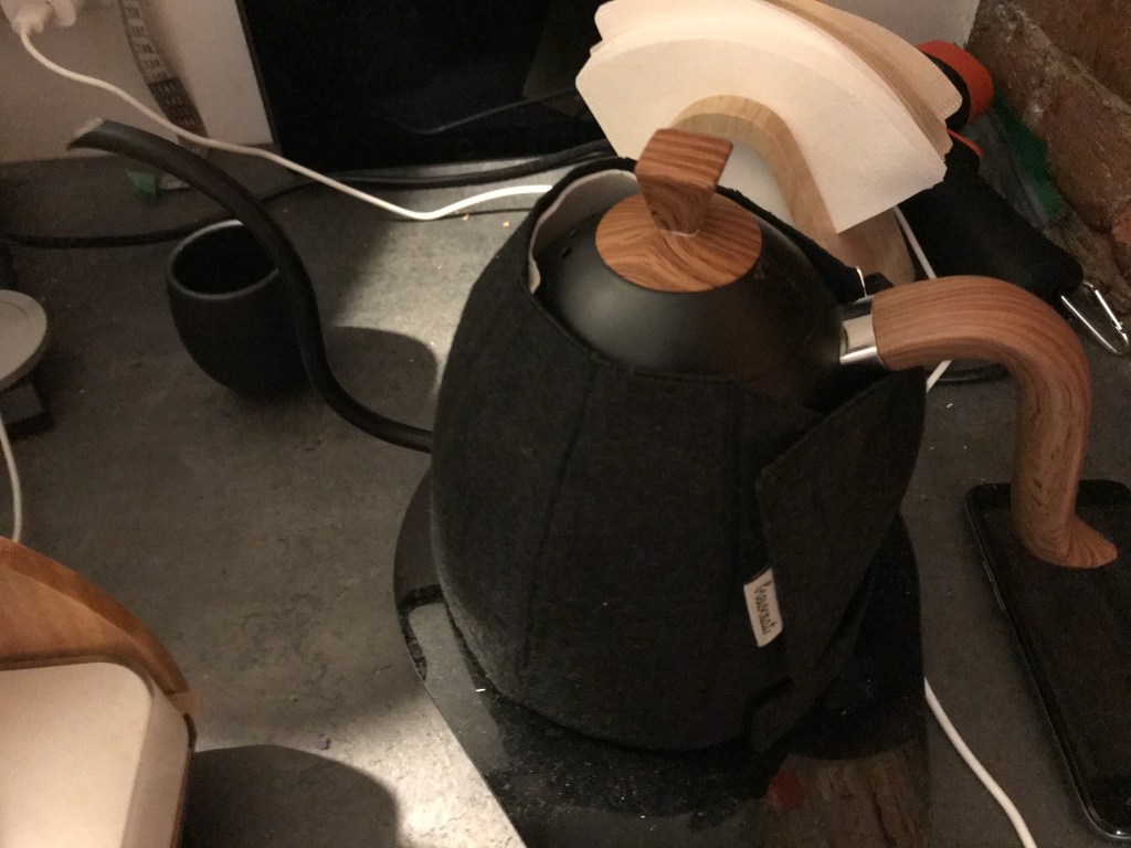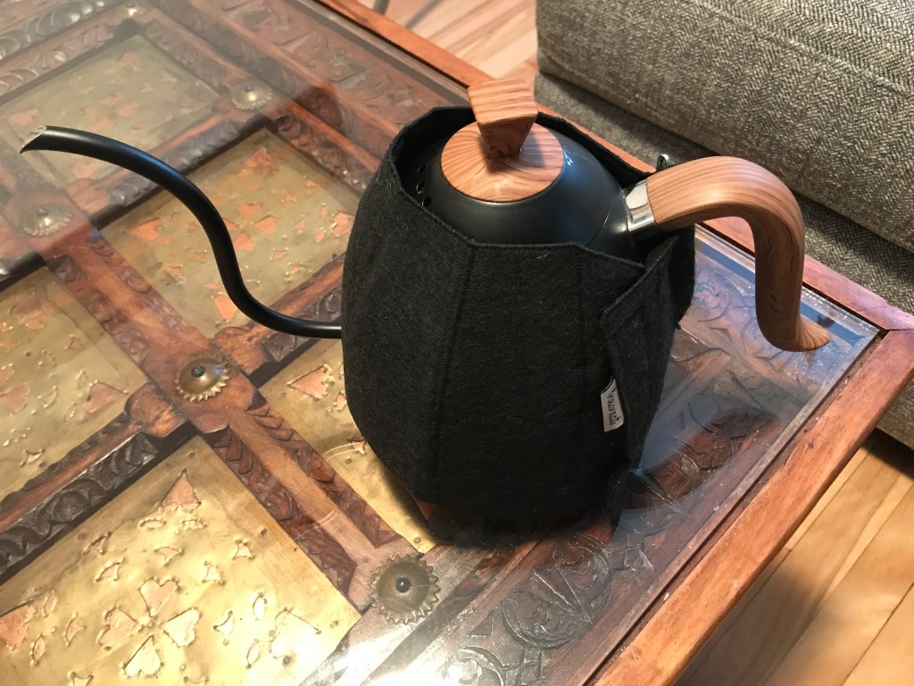 Lately I received the kettle Brewcoat that I ordered a few weeks back; I previously didn’t dare order one because they don’t make any for my Brewista artisan gooseneck kettle and they’re not cheap. Thanks to your support, I decided it was worth trying it and it would provide us with a “worst case scenario” of how a loosely fitting brewcoat improves kettle temperature stability. I went with the “Black felt/Black Polar Composite” version; I picked the Bonavita 1.0L kettle model because the size is very similar to the Brewista, and I was delighted that it fits quite nicely by adding just two pins: