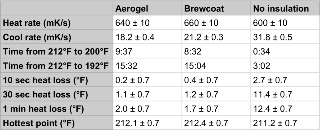 Another point that immediately becomes clear with the figure above is that adding a layer of aerogel provided significantly diminished returns, and would only be worthwhile if I planned to leave the kettle off for much more than 15 minutes. Maybe adding this aerogel layer could provide small energy savings over just the brewcoat in a coffee shop environment, but I doubt they would be significant.