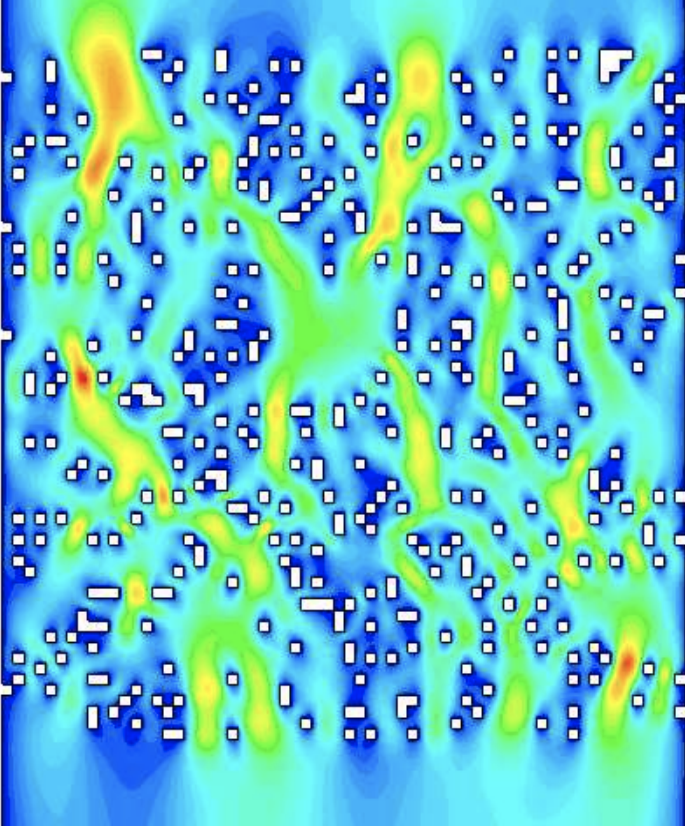 You can see how the flow of water is not very uniform, and some clumps of particles tend to be isolated from most of the flow (in the blue regions). In the context of coffee brewing, these particles will get under extracted. But now let’s see what happens if we pump up the flow of water, by applying more pressure on it: