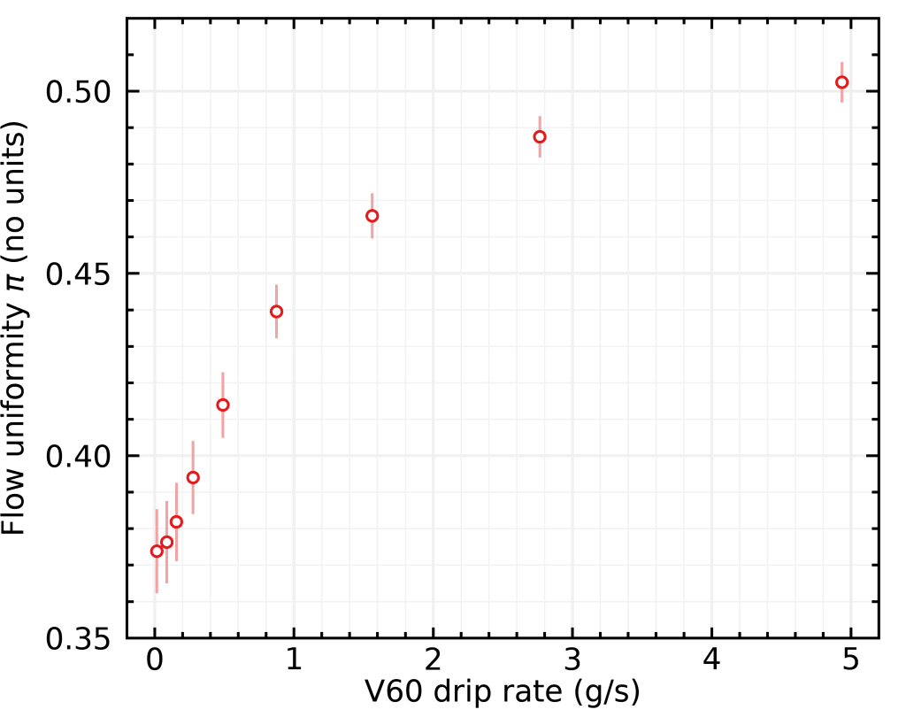 As you can see, very slow dripping rates correspond to a “flat” regime with very poor uniformity that doesn’t depend much on overall flow rate, but above the threshold of Re ~ 0.6 (or log Re ~ -0.25) you start getting more uniformity as you have more overall flow. Now the question is: what Reynolds numbers correspond to realistic V60 preparations ? Are we in the regime where flow has an effect on uniformity or not ?