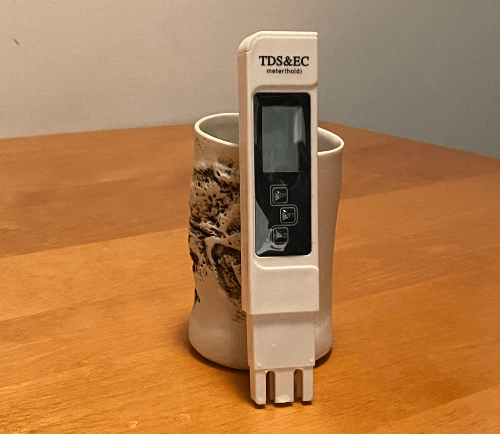 In the past, a lot of focus has been placed on measuring the approximate total dissolved solids in water using electrical conductivity meters like this one. These devices only measure the electrical conductivity (EC) of water as their name suggests, and then try to guess the total hardness of water assuming a specific composition. In general they are not very accurate, but changes in EC measurements can be useful to quickly notice a change in water composition. Most of them claim to apply an automated correction for temperature, required because the temperature of water also affects its conductivity. Unfortunately, I have come to stop trusting any of these claims, and I suggest making sure you always measure your water EC at a fixed temperature (25°C, i.e. 77°F, is typical).