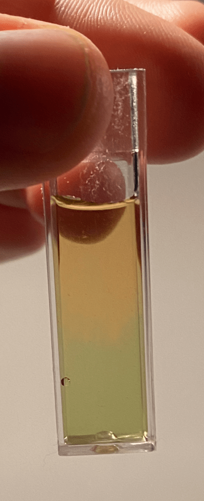 8. Stop counting when the full solution color has noticeably shifted even after you stir/shake the cuvette for a dozen seconds.