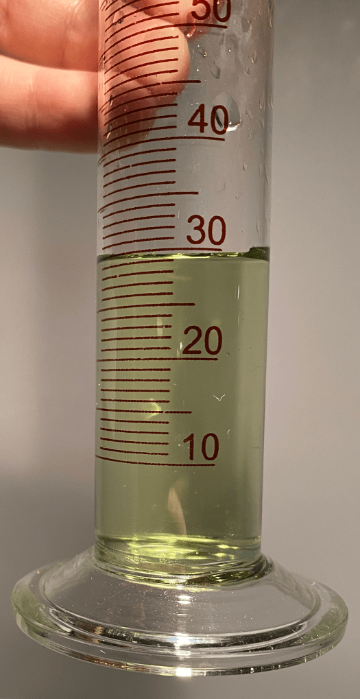 I highly recommend using this method at a room temperature in the range 18-25°C, because otherwise the mass density of the reactant drops and water could change too much, which would falsify the mass to volume relations that I hard coded into the spreadsheet. This method is a lot more robust against human error compared to a regular back titration. The step-by-step instructions are the same as a normal back titration; you just need to keep track of total water and reactant weights as you go.