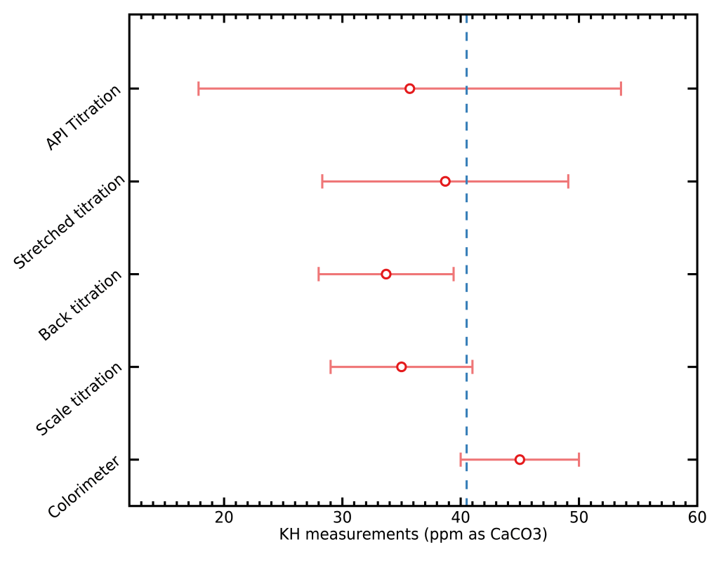 Measurements of total alkalinity made with the different approaches explained here (red circles with measurement errors), compared to the expected KH of the brew water recipe I crafted (vertical blue dashed line).