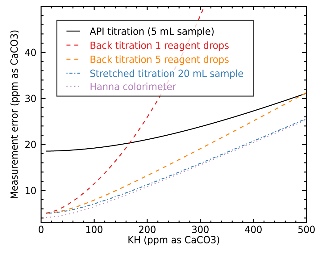 In order to illustrate when each method is preferable, you need to have an idea of whether your water is very hard or soft, and what type of precision you want to achieve. To help you decide, I built a figure illustrating the fractional error you would get for KH measurements with the different methods mentioned here, depending on your water’s total alkalinity:
