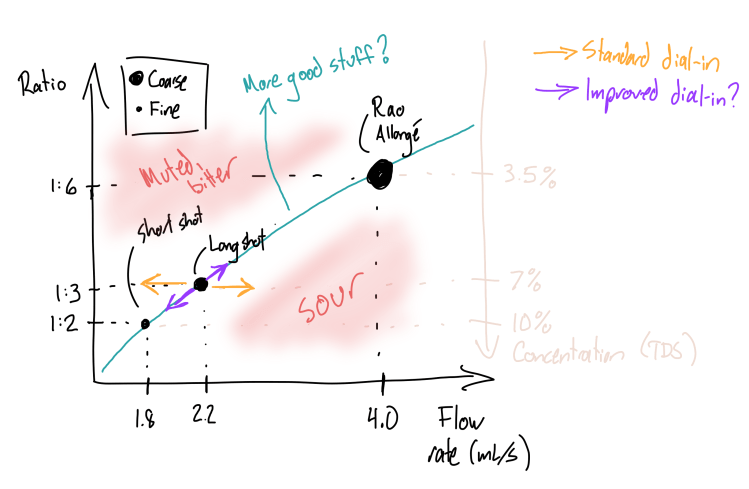 If that intuition turns out to be right, it begs another question: why would only typical espressos at 1:2 (1 part dry coffee to 2 parts water) or 1:3 ratios, and then the Rao Allongés at 1:5 to 1:6 ratios taste good? I don’t see an obvious reason to believe that there is nothing else good-tasting in between, or even on either sides of these two possibilities. Taste is obviously subjective, and the perception of taste is well known to depend a lot on concentrations, but what if those are just two recipes along a continuum of good-tasting recipes that peak near 9 bar and maintain a constant drip rate throughout the extraction?