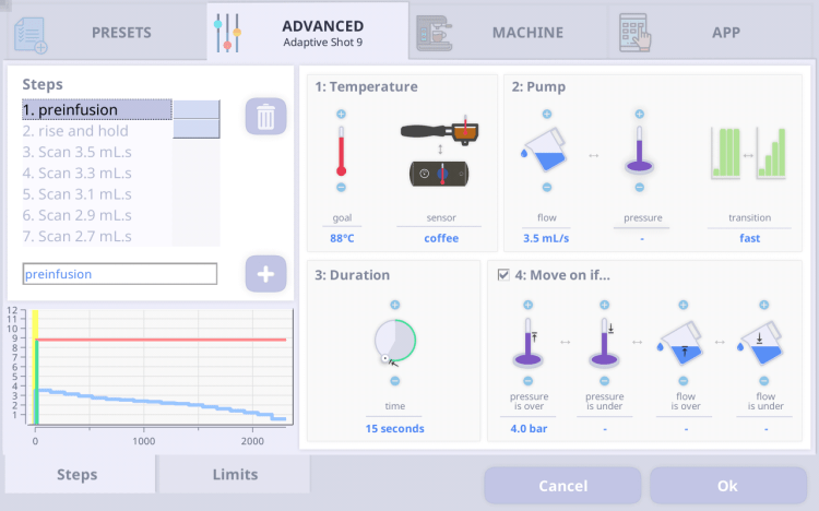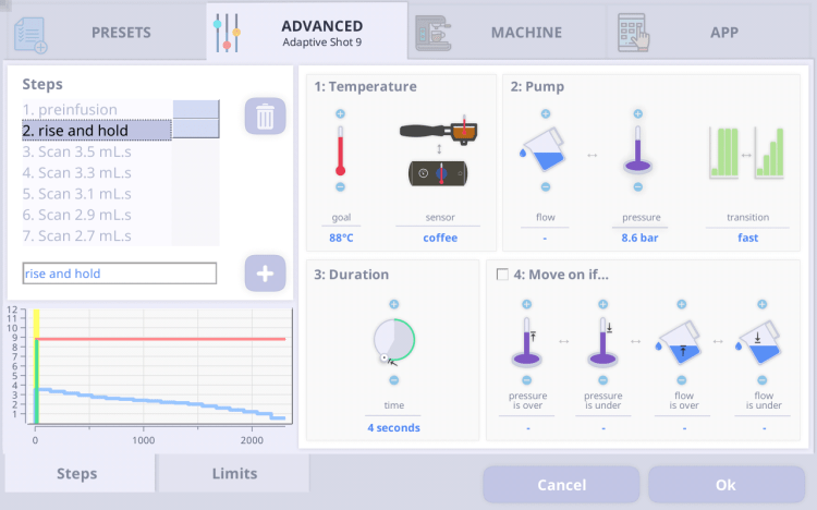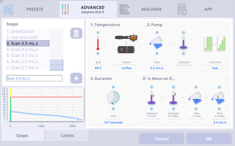 It may seem like every one of these steps starting from the third one are self-contradictory, but in practice this serves a purpose. Imagine you grind a bit too fine, and instead of reaching your goal of, say, a 2.2 mL/s flow rate during the extraction phase, you actually reach 1.8 mL/s. What will happen ? Well, the machine will peak at 9 bar because you asked it to, the flow rate will reach 1.8 mL/s, and then the machine will attempt to run step number 3, and it will ask the machine to up the flow rate to 3.5 mL/s while immediately starting to check that your flow rate is at least 3.4 mL/s. This happens so fast that the pumps won’t even have any time to react and the software will have triggered out of steps 4, 5, 6 and so on until the exit condition is not triggered anymore: this will happen at whatever step has an exit trigger slightly below your current flow rate (1.8 mL/s). In practice, this will happen at whatever step is asking the machine to reach a flow rate pretty close to 1.8 mL/s, and there you have it: you effectively asked the machine to keep whatever flow rate was currently going on.