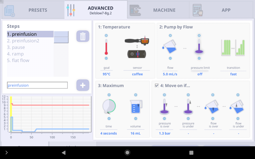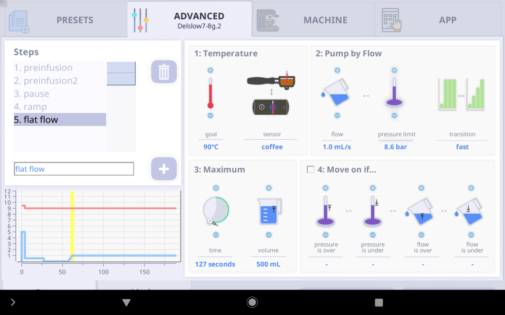 - I use a profile that I built on the DE1 with the following steps: (1) a fast preinfusion with 16—20 grams of water at 95°C; (2) a 23-seconds phase with a slow refilling of 90°C water at 0.5 grams per second to compensate for some water dripping; (3) a 30-seconds blooming phase without flow; and (4) a smooth transition to a 1.0 mL/s flow of 90°C water until about a beverage weight of about 73 grams has been reached. I initially use hot water because the cooler coffee bed will immediately lower the temperature of the incoming water, and then I stick with 90°C water because I have found hotter temperatures to produce a rancid taste even with light roasts.